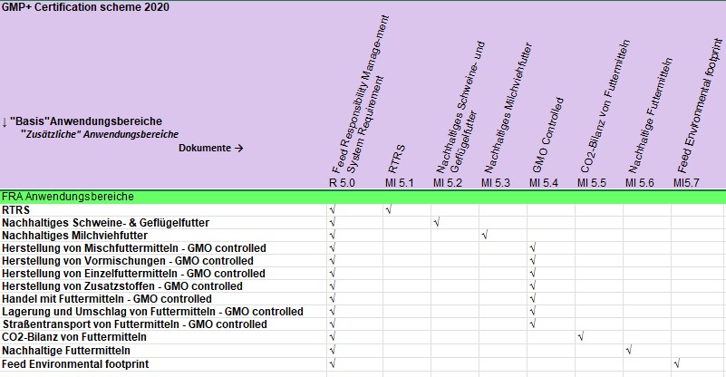 | Anwendungsbereiche für die Zertifizierung | Herstellung von Mischfuttermitteln - GMO Controlled Herstellung von Vormischungen - GMO Controlled Herstellung von Einzelfuttermitteln - GMO Controlled Herstellung von Zusatzstoffen - GMO Controlled Handel mit Futtermitteln - GMO Controlled Lagerung und Umschlag von Futtermitteln - GMO Controlled Straßentransport von Futtermitteln - GMO Controlled | |