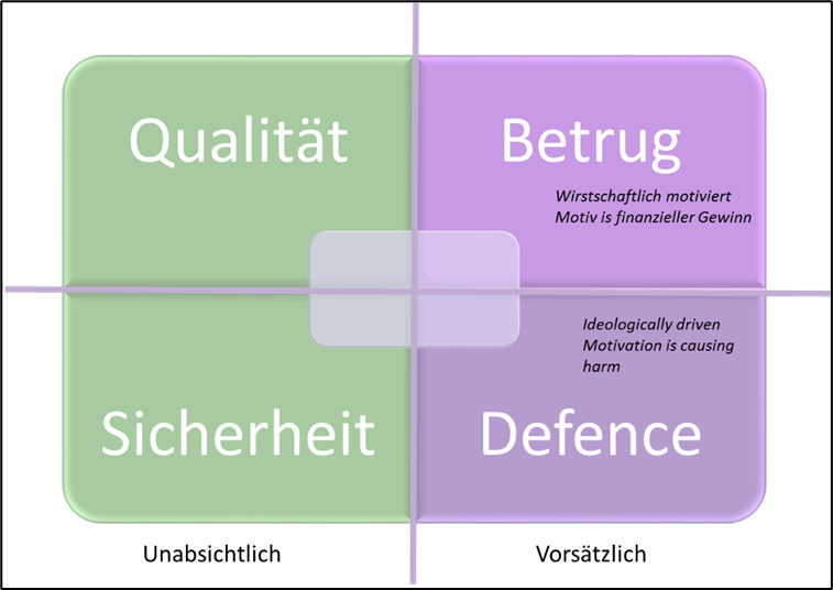 Die Verhütung von Futtermittelbetrug erfordert ein anderes Vorgehen als die Lenkung von Futtermittelsicherheit, -qualität und „feed defence“ Wie in Abbildung 1 gezeigt, sind die Zwischenfälle in Bezug auf Futtermittelqualität und Futtermittelsicherheit unabsichtlich, da der Futtermittelhersteller keine Beweggründe hatte, diese Zwischenfälle herbeizuführen, und es kein Krimineller ist, der diese Handlung ausführt. „Feed defence“ ist der Schutz von Futtermitteln gegen eine ideologisch motivierte Verunreinigung oder Verfälschung mit biologischen, chemischen, physischen oder radiologischen Mitteln. Futtermittelbetrug ist eine vorsätzliche Handlung, deren Beweggrund finanzieller Gewinn ist.7