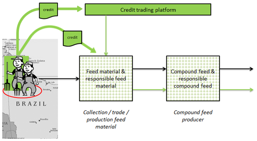 The supply chain model book & claim represents the trade of credits through a credit trading platform, where the certificates are separated from the physical flow of feed material. Companies that buy feed material on the regular market can purchase ‘responsible feed material production credits’ directly from growers. These credits equal the responsible production of a certain amount of responsible feed material. After having bought credits, a company can publicly claim to have supported responsible production of equivalent volumes of feed materials.