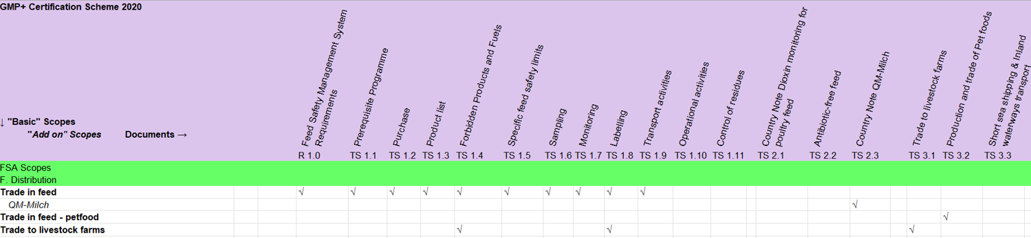 For each GMP+ scope for certification Scheme documents (Feed Safety Management System Requirements and/or Technical Specifications) are applicable. In the tables below you can find per GMP+ scope for certification which Scheme documents are applicable.
