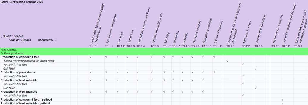 - Although special attention was paid when drawing up these tables, it might be possible that because of your specific activities, you also have to comply with other (parts of) scheme documents than indicated in the tables, or with specific national legislation. It remains the responsibility of the feed company to select all relevant scheme documents and to comply with all relevant requirements.