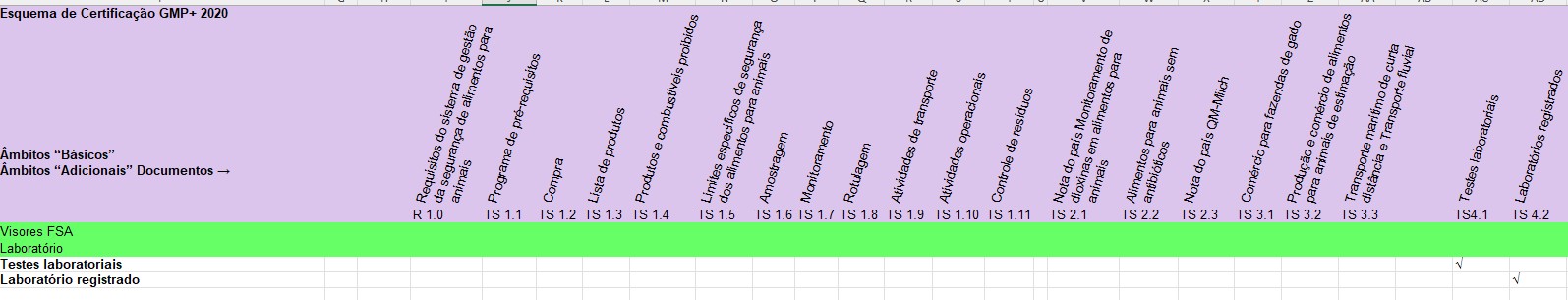 Para cada escopo da certificação GMP+, aplicam-se os documentos da norma (Requisitos do Sistema de Gestão da Segurança de Alimentos para Animais e/ou Especificações Técnicas). Nas tabelas abaixo, pode encontrar por escopo da certificação GMP+ quais os documentos da norma que se aplicam.