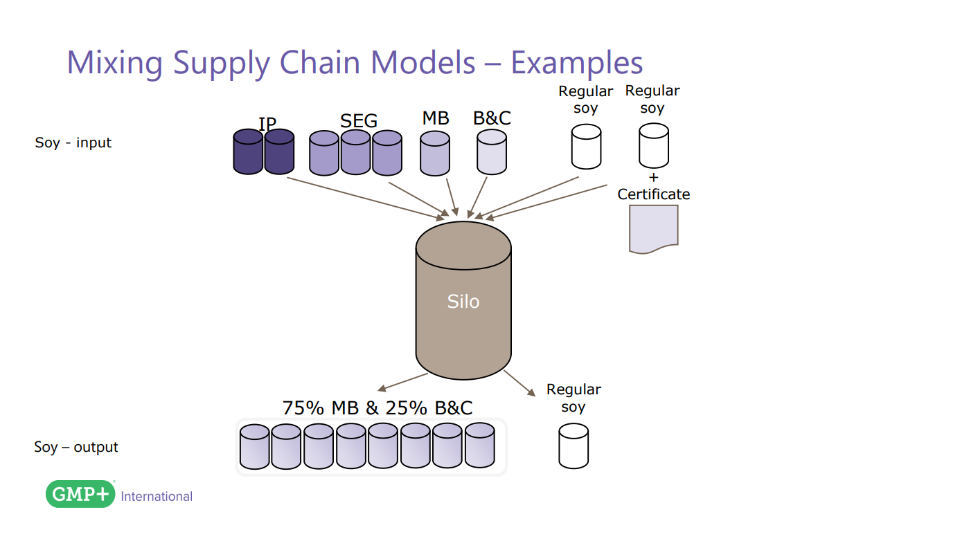 When in total 50 ton of Identity Preserved (IP), Segregation (SEG), and Mass Balance (MB) soy are purchased and 50 ton of Book & Claim (B&C) soy is purchased, and all mixed together, this soy is delivered as 50 ton Mass Balance soy and 50 ton Book & Claim soy.